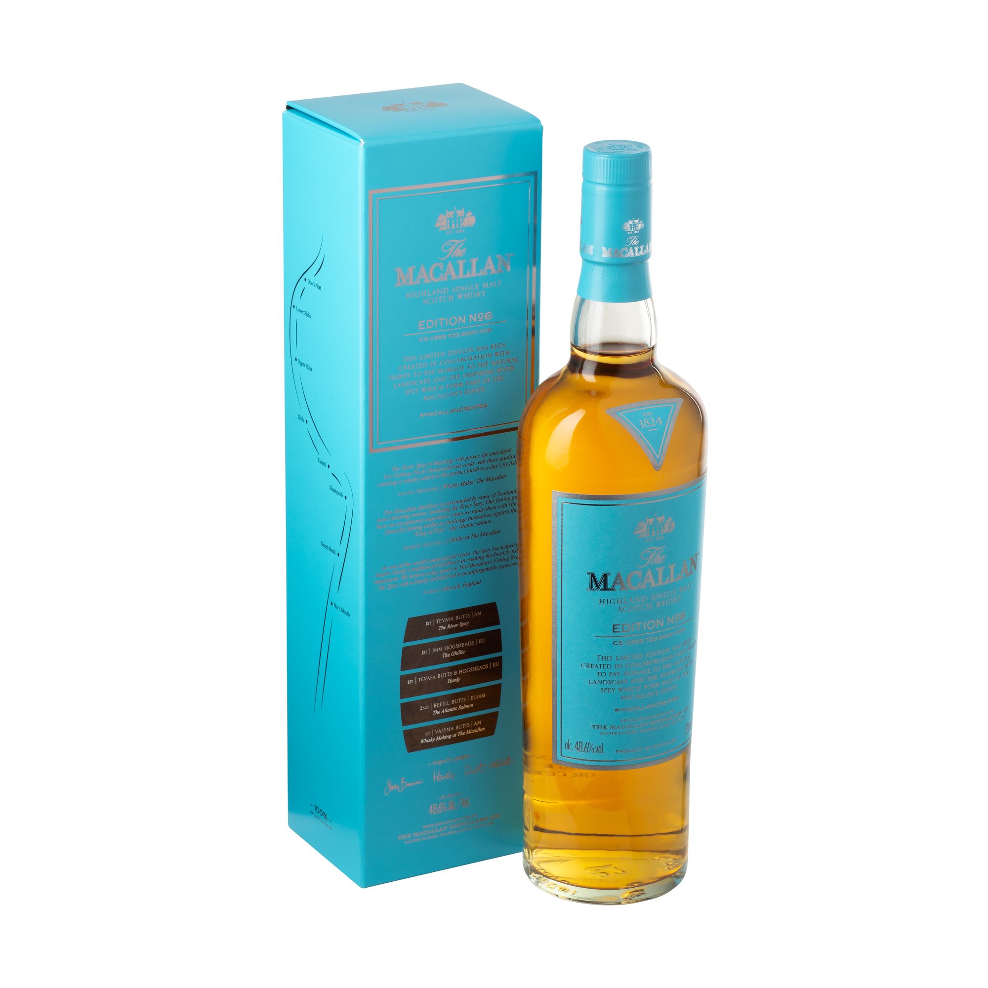 Inspired by the remarkable experience offered by the Spey, The Macallan Whisky Maker, Steven Bremner, created Edition No.6 by choosing five cask styles that embody unique stories related to the river and its unparalleled natural landscape. Crafted from a combination of American and European oak sherry seasoned casks, Edition No.6 captures the River Spey’s energy; the warm, welcoming personality of The Macallan’s Ghillie; the classic craftsmanship of Hardy; the extraordinary life of the Atlantic salmon on the beat; and the mastery of whisky making on The Macallan Estate, which has taken place since 1824.