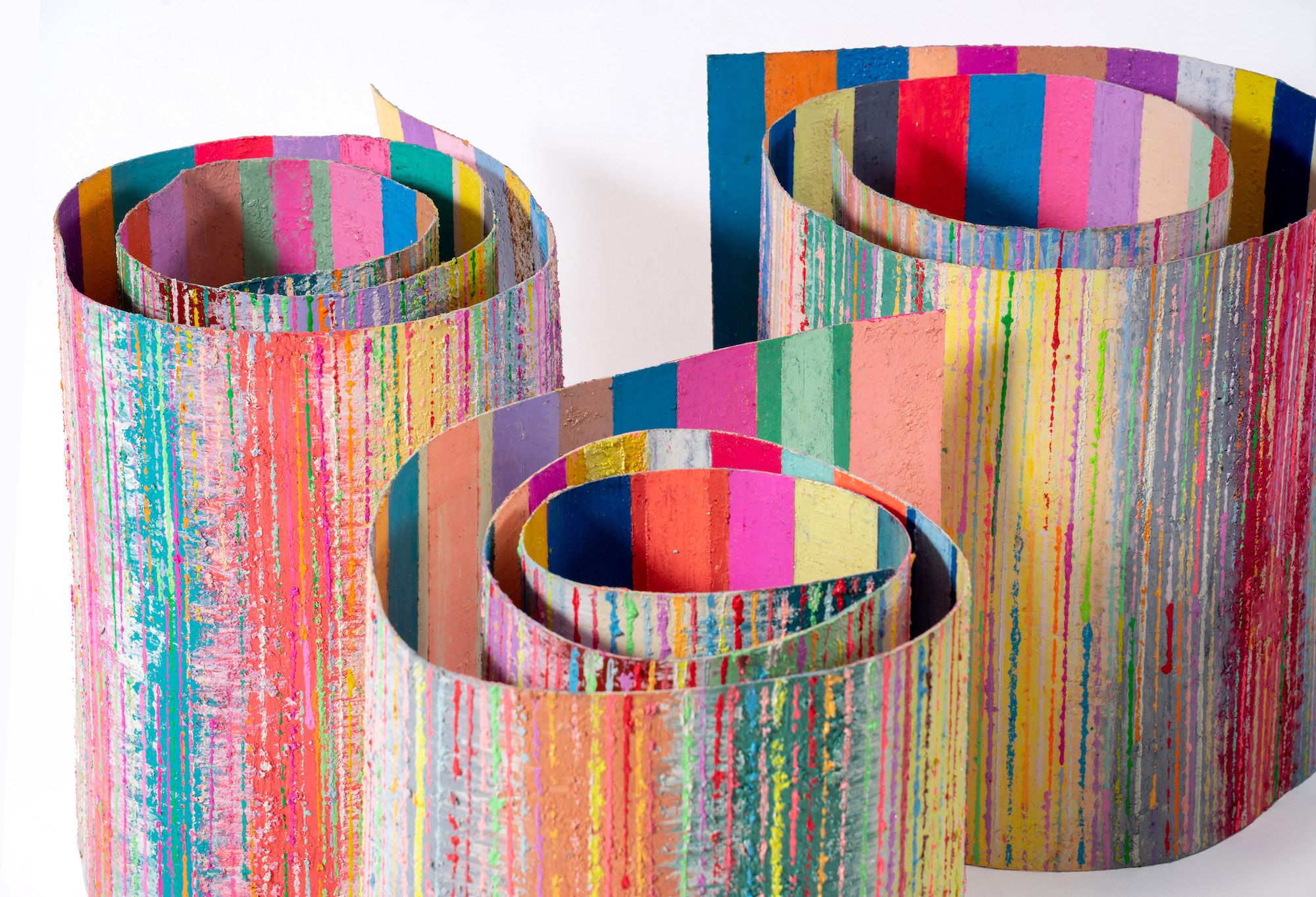Stepping into Rossi & Rossi in Hong Kong’s Wong Chuk Hang industrial area, I was immediately submerged in a wave of colour and texture. Unframed, auroral paintings twain in ridged texture whilst being juxtaposed by delicate pigmented pastels. Long strips of ribbon-like screens hanging from the ceiling throughout the front space, heavily layered with saturated paint and dripping with texture. Sporadically placed multicoloured scrolls of coiled canvases coated in viscous paint, hardened to create its structural shape bordered the room. Challenging the flux and flow of intermixing colours, textures and free flowing forms, the artworks intertwine harmoniously, radiating a calm peacefulness. “Royal Marketplace” presents selected bodies of work from renowned Thai artist Mit Jai Inn, exemplifying the artist’s approach to art-making, described as a meditative-like process in which he enters a complete state of consciousness whilst creating his painted forms, pushing the boundaries of colour, texture and structure.